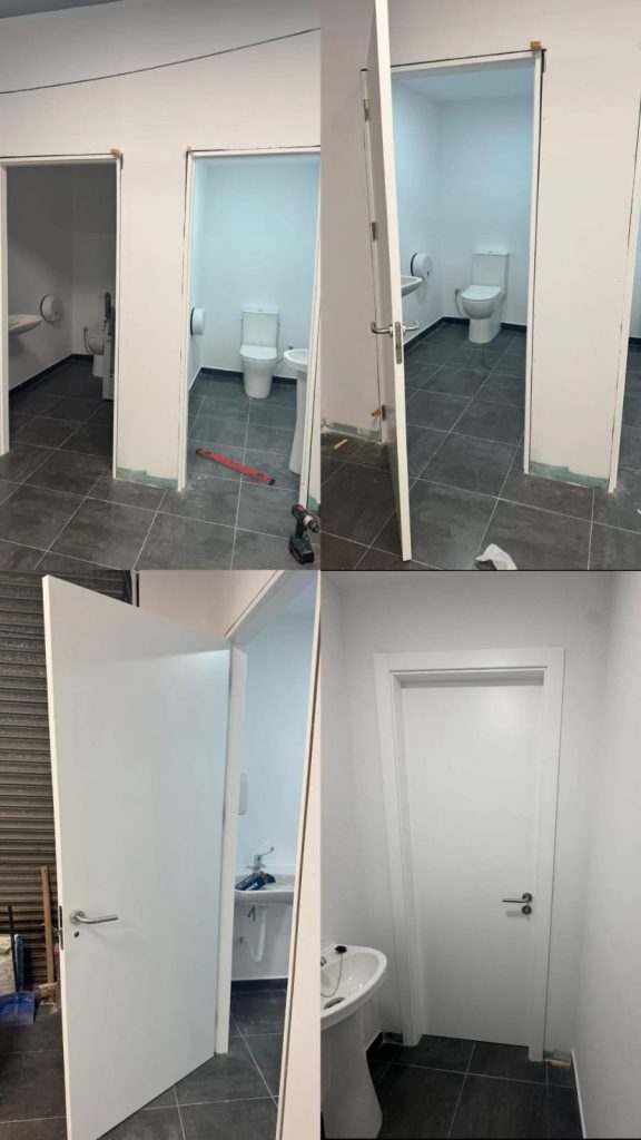 Fabricación e instalación de puertas correderas en aluminio Cortizo color blanco y puerta pivotante en MdF hidrófugo lacado en blanco mate con ojo de buey y rejilla ventilación para instalaciones del Tanatorio en el pueblo de Mogán